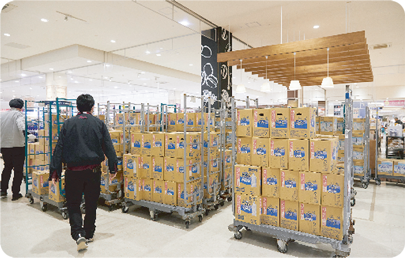 発災直後でもグループの総力をあげて食料品、飲料水、ポリタンク、簡易トイレ、カセットコンロなどを調達。被災地のお客さまが「今、必要なものを買える」状況を整えます。