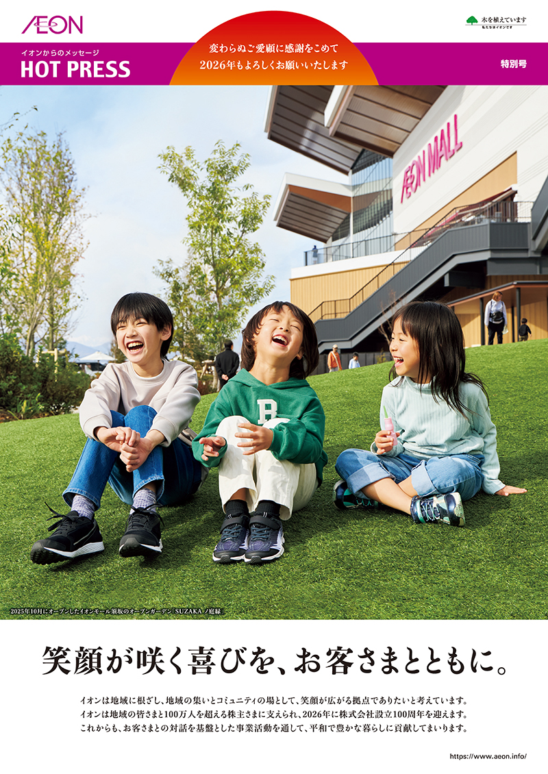 イオンは地域に根ざし、地域の集いとコミュニティの場として、笑顔が広がる拠点でありたいと考えています。イオンは地域の皆さまと100万人を超える株主さまに支えられ、2026年に株式会社設立100周年を迎えます。これからも、お客さまとの対話を基盤とした事業活動を通して、平和で豊かな暮らしに貢献してまいります。