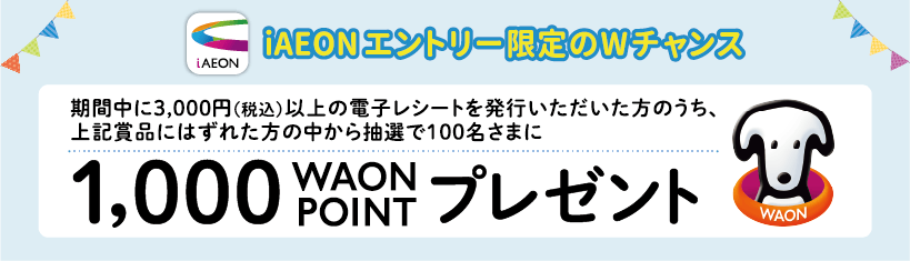 iAEON エントリーいただいた方のうち、期間中 3,000 円(税込)以上の電子レシートを発行いただいたお客さまは W チャンスの対象となります。(体験コースにはずれた方の中から抽選となります)