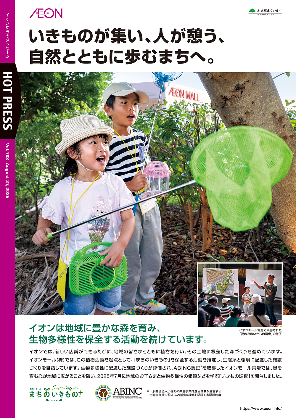 イオンでは、新しい店舗ができるたびに、地域の皆さまとともに植樹を行い、その土地に根差した森づくりを進めています。イオンモール(株)では、この植樹活動を起点として、「まちのいきもの」を保全する活動を推進し、生態系と環境に配慮した施設づくりを目指しています。生物多様性に配慮した施設づくりが評価され、ABINC認証を取得したイオンモール常滑では、緑を育む心が地域に広がることを願い、2025年7月に地域のお子さまと生物多様性の価値などを学ぶ「いきもの調査」を開催しました。