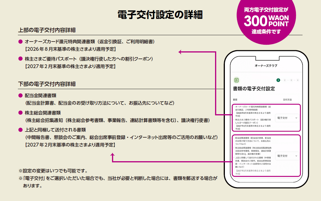 * 4/16以前にオーナーズカードをiAEONに登録済の株主さまも対象になりますが、規約同意(電子交付選択)が必要です。