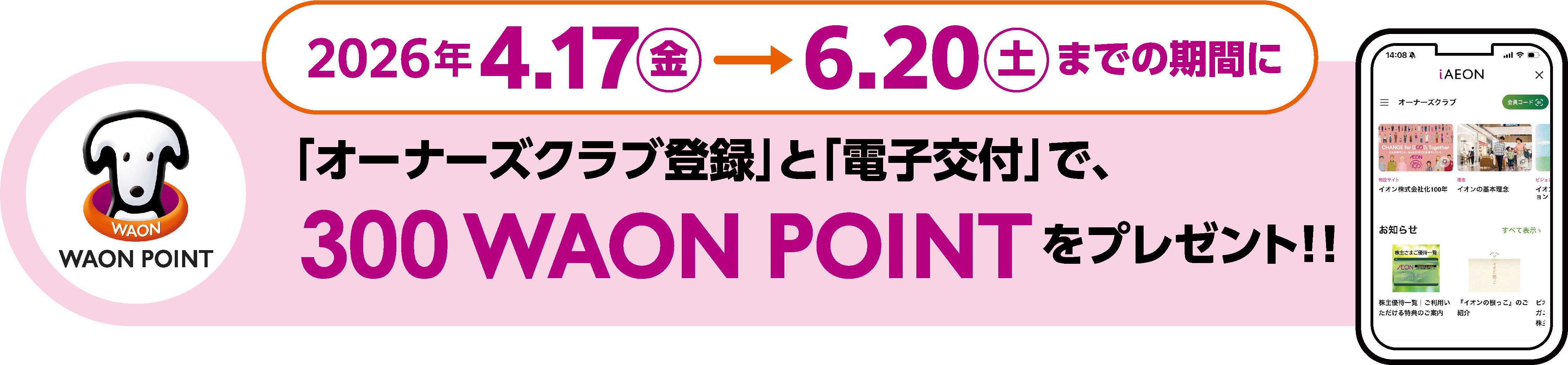 対象期間中に「イオンオーナーズクラブ」に登録し、書類の交付方法で『電子交付』を選択した方を対象に、もれなくWAON POINT 300ポイントを進呈します。