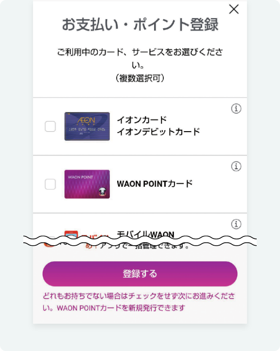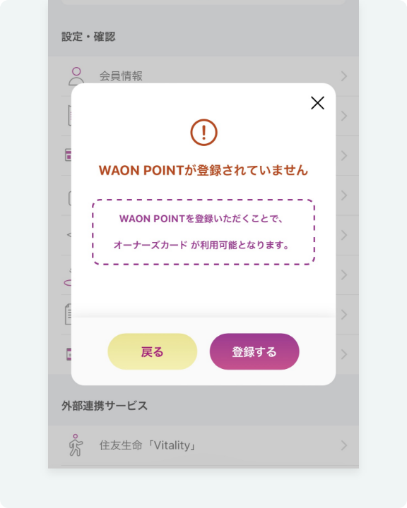 iAEONでオーナーズカードをご利用いただくには、WAON POINTの受け取り可能なカード登録が必要となります。未登録の場合は以下の手順でご登録をお願いいたします。
