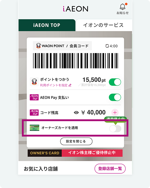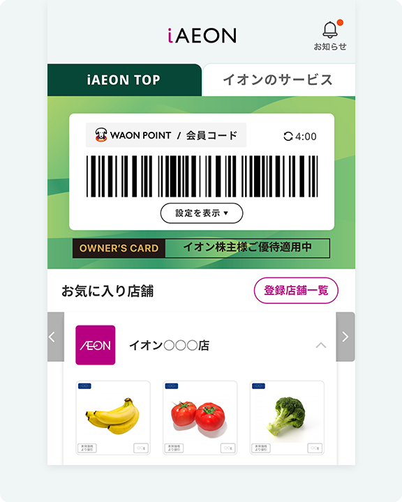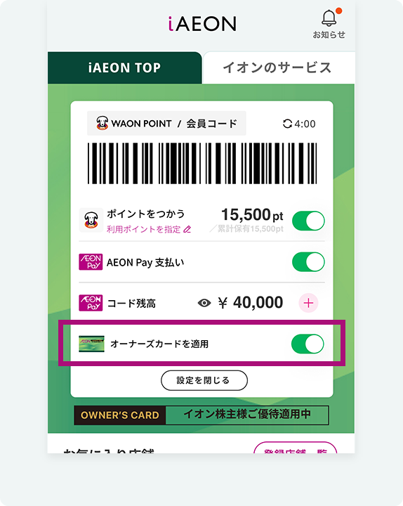 • iAEON版オーナーズカードのご利用に際しては、お支払い前に、iAEONアプリ内の「会員コード」の画面を表示し、オーナーズカード適用の状態を確認のうえ会員コードを読み込んだ後に特典対象となるお支払い方法でお支払いください。