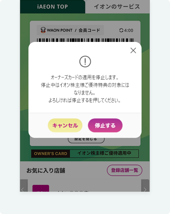 停止中はイオン株主さまご優待特典の対象にはなりません。ご確認いただき、よろしければ停止するを押してください。