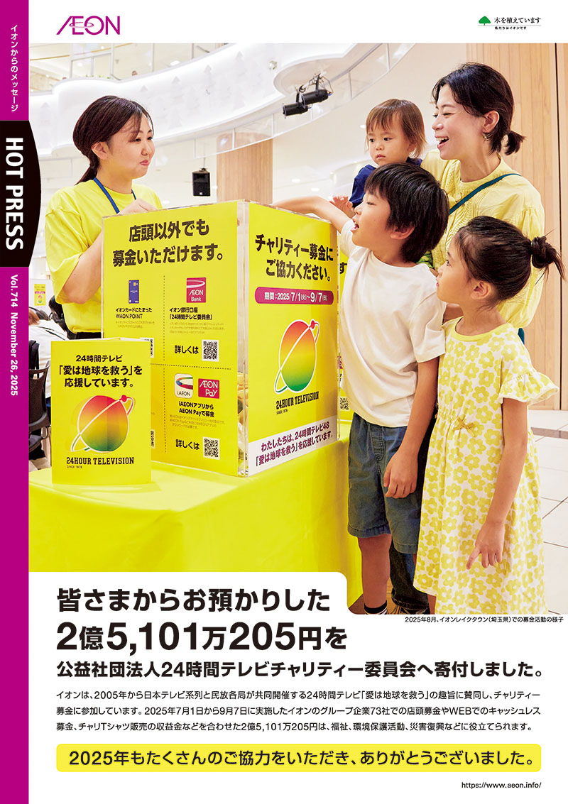 イオンは、2005年から日本テレビ系列と民放各局が共同開催する24時間テレビ「愛は地球を救う」の趣旨に賛同し、チャリティー募金に参加しています。2025年7月1日から9月7日に実施したイオンのグループ企業73社での店頭募金やWEBでのキャッシュレス募金、チャリTシャツ販売の収益金などを合わせた2億5,101万205円は、福祉、環境保護活動、災害復興などに役立てられます。