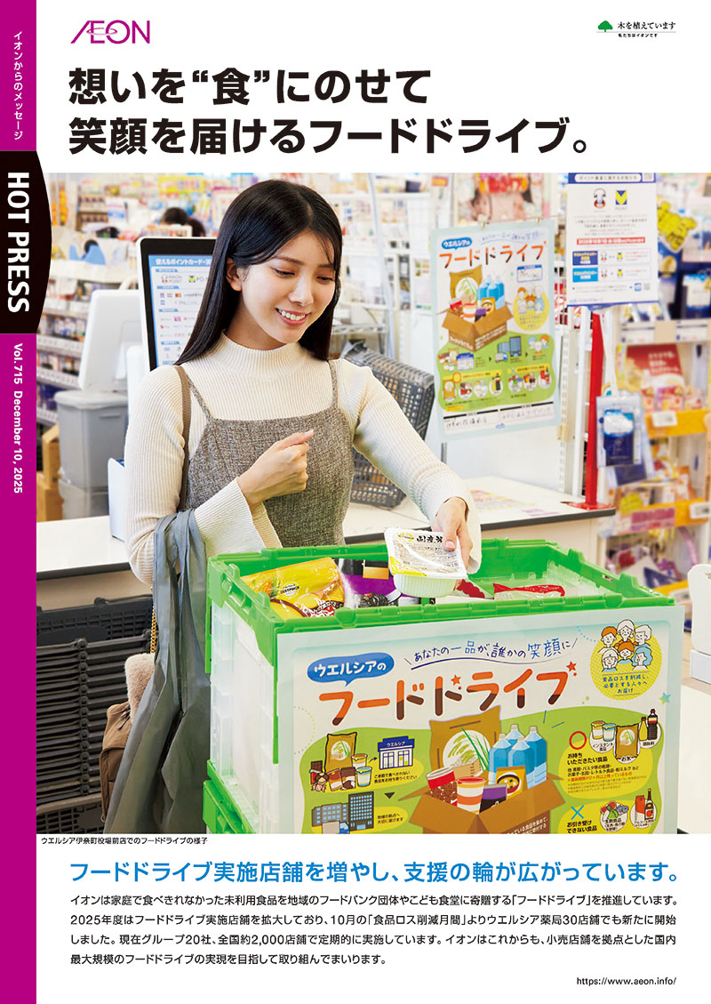 イオンは家庭で食べきれなかった未利用食品を地域のフードバンク団体やこども食堂に寄贈する「フードドライブ」を推進しています。2025年度はフードドライブ実施店舗を拡大しており、10月の「食品ロス削減月間」よりウエルシア薬局30店舗でも新たに開始しました。現在グループ20社、全国約2,000店舗で定期的に実施しています。イオンはこれからも、小売店舗を拠点とした国内最大規模のフードドライブの実現を目指して取り組んでまいります。